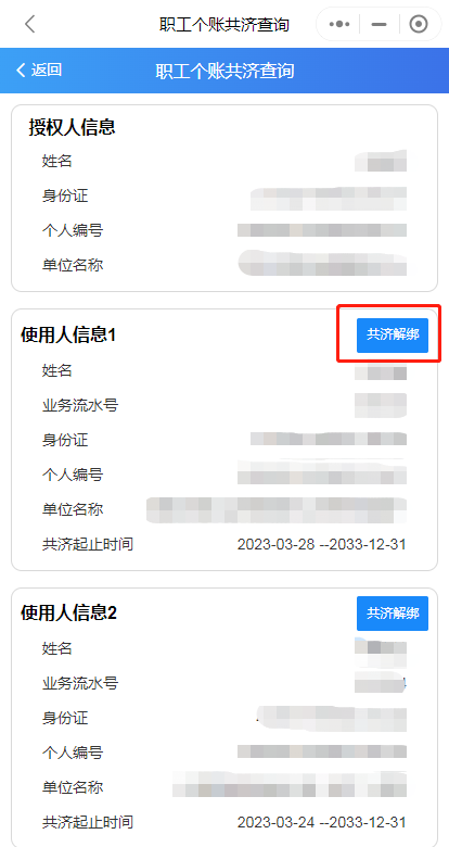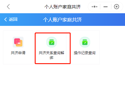 第四步:辦理完成后,可通過“家庭共濟”——“共濟關系查詢解綁”查詢綁定情況,“解除綁定”功能也可在此界面操作。