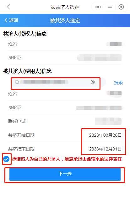 第三步:輸入被綁定人身份證號,選擇共濟時間,勾選承諾,點擊下一步,綁定成功。