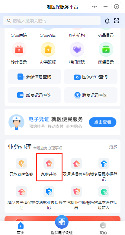 第一步:下載“湘醫(yī)?!盇pp,或進入“湘醫(yī)?!盇pp小程序,登錄后在首頁“業(yè)務辦理”中找到“家庭共濟”,點擊“共濟申請”。