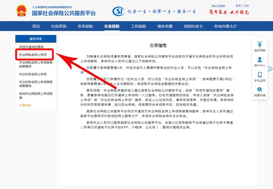 3、登錄“國家社會(huì)保險(xiǎn)公共服務(wù)平臺(tái)”(http://si.12333.gov.cn),點(diǎn)擊【失業(yè)保險(xiǎn)】→【失業(yè)保險(xiǎn)待遇申領(lǐng)】→【失業(yè)保險(xiǎn)金網(wǎng)上申領(lǐng)】辦理。